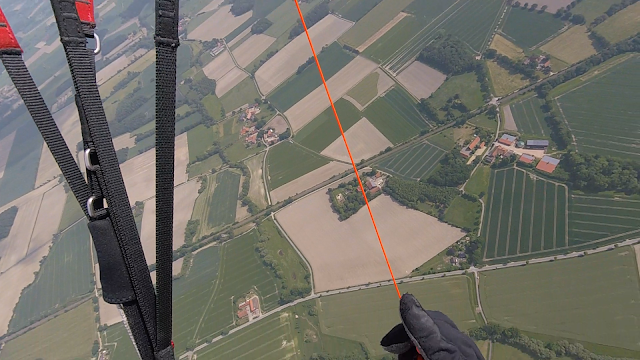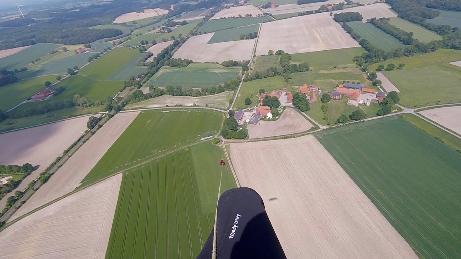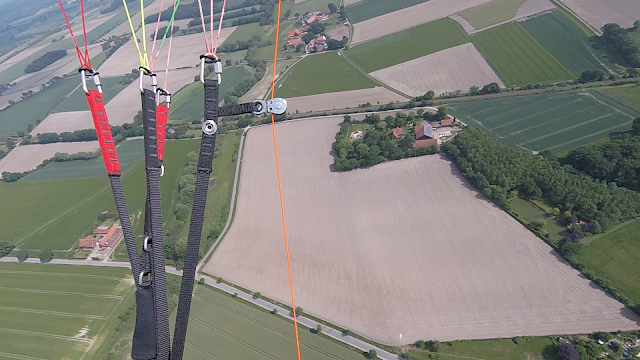 Wenige Minuten später drehe ich mit ordentlicher Schräglage den nun sicheren Thermikbart nach oben aus. Selbst wenn die Thermik bei uns im Flachland nicht so stark ist wie in den Bergen: “wie ein Korkenzieher” mit Schräglage und 3-4 m/s nach oben zu eilen ist einfach genial und macht riesig Spass!