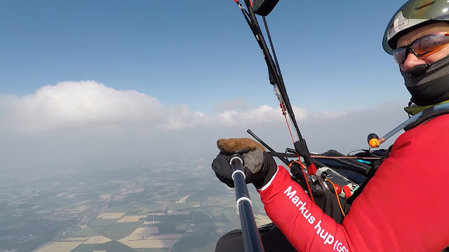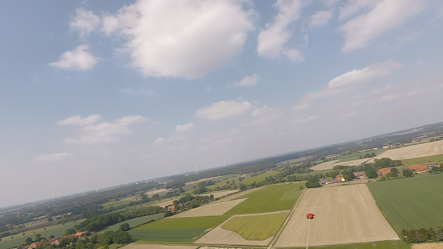 Ich fliege dann in Richtung Nordwest, in Richtung Ahaus. Erneut finde ich dort gute Thermik und bin schnell wieder oben. Heute sind die Wolken einfach zu “lesen” entweder ist es an der dunkelsten Stelle wo es am besten steigt oder es sind die kleinen “fransigen” Wolkenfetzen die auf der Sonnenseite ganz häufig zu finden sind. Dort ist die Thermik meist am stärksten aber auch ein bisschen ruppig. Ich probiere viel aus, versuche die Auf- und Abwinde zu verstehen. Heute ist ein Tag wo man das gut trainieren kann. Heute verhält sich die Thermik mal wie im “Lehrbuch”.