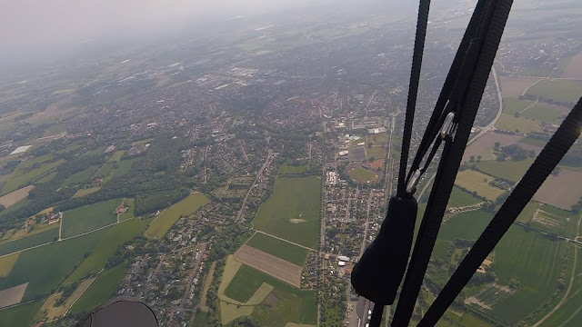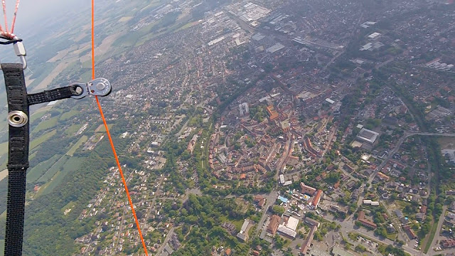 Ich entscheide mich für einen ersten Ausflug in Richtung Coesfeld. Immer ein toller Ausblick und meist steht am nördlichen Rand der Stadt auch eine gute Thermik. Heute ist Kirmes in der Stadt und aus der Höhe kann man die drehenden Fahrgeschäfte erkennen. Ohne Zeitstress und Hektik genieße ich den Ausblick auf den historischen Stadtkern und drehe in der Thermik, die dort auch wieder einmal war wie vermutet, meine Kreise. Sehr schön!