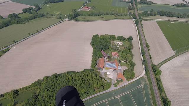 Der erste Bart bringt mich auf über 1.300 m über Grund. Wow, endlich mal wieder ordentliche Thermik und Arbeitshöhe bei uns im Flachland. Ich genieße die Aussicht und fliege zunächst zurück über das Schleppgelände, vielleicht ist noch ein weiterer Pilot mit aufgestiegen und man könnte zusammen ein paar Kreise ziehen?